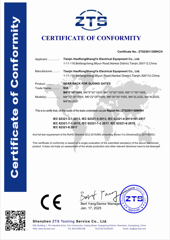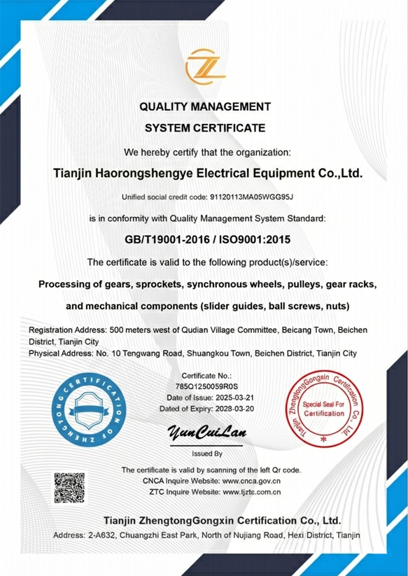 Tianjin HaoRongShengYe Electrical Equipment Co.,Ltd. is located in economic developed, charm port city Tianjin. Our company is established in 2008 with abundant registered capital. It is a manufacturing enterprise with specialized in production and export standard and OEM high precision gear, gear rack, sprocket, roller chain, timing pulley, timing belt and other mechanical transmission products.